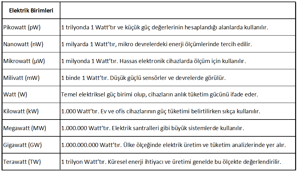 Elektrik birimleri, genellikle "güç" ve "enerji" olarak iki ana başlık altında sınıflandırılır. Güç birimleri watt (W) temellidir ve anlık olarak ne kadar enerji tüketildiğini ya da üretildiğini gösterir. Enerji birimleri ise belirli bir süre boyunca tüketilen veya üretilen elektrik miktarını ifade eder ve watt-saat (Wh) cinsinden ölçülür. Bu nedenle elektrik terimleri arasında geçen megawatt, gigawatt, kilowatt-saat gibi kavramlar hem büyüklüğü hem de zamanla olan ilişkisi açısından birbirinden farklıdır.